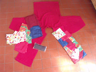 The idea is to chop up an old sweatshirt, and then just sew on the patch pieces.